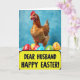 Designed with a springtime scene, the card features a detailed russet-brown hen near the top, its scarlet comb and alert gaze giving the moment a caring, watchful feel. Below her, a clustered row of decorated eggs creates a festive base, with glossy shells in crimson, lemon, emerald, and cerulean. The eggs are covered in simple squiggles, dots, and abstract markings that suggest someone took time to decorate them for a loved one 🐰. Behind everything is a softly blended sky-blue background that keeps the focus on the hen and eggs. A bright yellow rectangular banner sits across the lower middle area, outlined with a thin black border. Centered on the banner, dark lettering reads “DEAR HUSBAND HAPPY EASTER!”, standing out clearly against the yellow. The hen hovers above the colorful eggs while the yellow banner stretches across the scene like a sunny signpost 🌷.