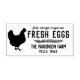 Fresh eggs stamp with a hen and a greenery divider. Free range organic in a charming script. Fresh eggs in a vintage inspired text. The name of your farm and town, state beneath. Farm eggs stamp personalised with the name of your farm.