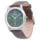 Stylish leather strap wrist watch, with the classic teal clan Henderson tartan plaid pattern, on the face, with white numbers and dots for the hours. White custom text reads Henderson, and can be personalised to read what you want.