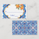 She found her Main Squeeze bridal shower blue orange place cards, blue Majjolica Spanish Mediterranean tiles bunch of oranges with modern casual script, nice for summer outdoor functions place cards