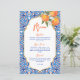 She found her Main Squeeze bridal shower blue orange menu card template, blue Majjolica Spanish Mediterranean tiles bunch of oranges with modern casual script, nice for summer outdoor functions personalised menu cards.
