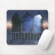 Standing on a candlelit balcony at night, looking out on red roses and a willow tree growing on the grassy bank of a lake. The bright rays of the silver moon stream through the window arches.