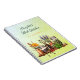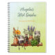 Spiral bound, herb garden notebook. A shelf of jars containing herbs, berries and flowers is the design. Customise fun, script text at the top. Pale blue and green, vertical stripes make up the background. A little swirl border separates the text from the herb jars. Lined pages can hold planting, growing, and harvesting information, along with homemade, herbal remedies and teas.