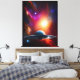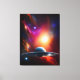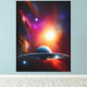 An amazing UFO flying though a brilliant sky filled with vibrant colors and stars.