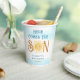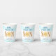 These baby shower paper cups feature the text "Here Comes The Son" in stylish blue and brown typography with a cute yellow watercolor sun and blue sky.