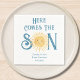 These baby shower paper napkins feature the text "Here Comes The Son" in blue retro typography with a cute yellow watercolor sun.