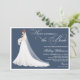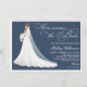 Here comes the bride bridal shower invitation features gorgeous glam but modest bride-to-be in wedding gown. Back of invite features dainty lace pattern. Multiple colour options in addition to customising bride’s hair style, colour and skin tone.