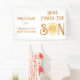 This cute boy's baby shower banner features the text "Here Comes The Son" in brown retro typography with a smiling yellow watercolor sun. Easily customisable. Original Watercolor © MicheleDavies.