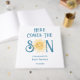This baby shower guest book features the text "Here Comes The Son" in blue retro typography with a cute yellow watercolor sun.