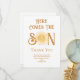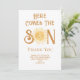 This cute boy's baby shower thank you card features the text "Here Comes The Son" in stylish brown typography with a smiling yellow watercolor sun. Easily customisable. Original Watercolor © Michele Davies.