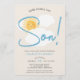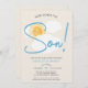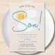This cute boy's baby shower invitation says "Here Comes the Son" in blue modern script calligraphy and features watercolor sunshine and clouds. Original Watercolor © Michele Davies.