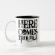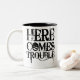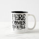 Here Comes Trouble :: Gorgeous, fun and grungy our Here Comes Trouble features a vintage distressed Rock Typography and a wild little emoticon at the centre. Our Here Comes Trouble design is full of bad girl attitude and fun.com