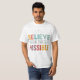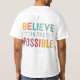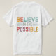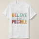 The t-shirt features a bold and uplifting message: "Believe in the Possible." The text is rendered in a multicolor scheme, with each word a different vibrant hue. This creates a dynamic and inspiring design that grabs attention.
