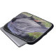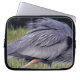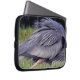 The great blue heron, in the original photograph by MaeFlowers on this 10” Laptop Sleeve, is puffing up his feathers as he walks towards another heron, an invader in his territory. The photo is a closeup of the wild bird's body in profile, showing the long, thin plumage rising at the top, and the wider wing feathers underneath. The heron's body is a soft bluish grey colour, with the blue coming out in the sunlight. There are black feathers on the curve of the wing, with a touch of reddish brown and white. The background is wild grass at water's edge, with a rippled reflection on the water.