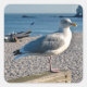 Closeup herring gull (Larus argentatus) perched on a wooden fence and the pebble beach of Etretat in Normandy in France