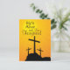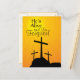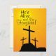 Inspirational quote customised Easter Postcard has three crosses on a hill with bright yellow golden sun rays.It features 'He's Alive and I'm Forgiven'. The greeting can be modified.*