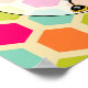 A happy honey bee with his scoop of honey standing in a transparent circle with a black border. A cool hexagon hive shaped background in vintage colours of pink, blue, orange and green.
