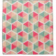 A shower curtain with a geometric pattern made up of six sided hexagons divided by a narrow white space each divided into six colour segments in five harmonious colours.