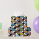 This wrapping paper has a mid-century modern design of repeating hexagons in retro colours with starbursts.