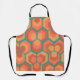 This apron has a geometric design of hexagons in sets of three that look like flowers in gold, orange, and red on a field of teal.