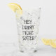 This water glass is perfect for your daily water intake! It has a fun font design with the words "HEY DRINK MORE WATER" printed on it.
