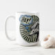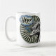 A cheerful greeting in classic comic style. This mug features a bright ostrich face saying "HEY!" in a thought bubble—a fun, friendly way to start your day. DSE Graphics | Art with Attitude.