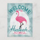 Hialeah Florida pink flamingo. In vintage travel posters style, it says "Welcome To Hialeah, Florida" in pink, white and mint green turquoise.