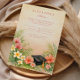 A soft parchment backdrop is framed by lush tropical greenery and coral hibiscus blooms, creating a fresh yet elegant celebration aesthetic. Delicate plumeria accents and airy palm leaves bring a warm, destination-inspired feel, while the classic typography keeps the layout refined and timeless. A subtle graduation cap detail grounds the design with just the right academic touch.