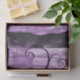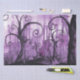 Original artwork done with acrylic paint on canvas. A surrealistic fantasy landscape, silhouetted trees with branches that subtly curl into heart shapes sit on rolling hills in front of a purple sky.