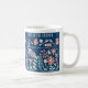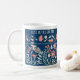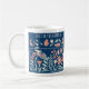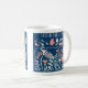 Stay entertained while you sip your favourite hot beverage with this illustrated coffee mug. That's because this coffee mug is actually a fun hidden picture game with 9 illustrations of familiar objects hidden inside a pretty garden. The graphic in mint green, coral and cream or ivory is set against a navy blue background.