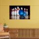 Hitting the pins "high flush" almost always results in a strike. Ten pins about to be crushed by the spinning blue bowling ball entering the one three pocket. Bowling graphic with actual ball and pins. Perfect for the "bowlers" man cave or office.