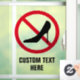 High heel stiletto shoes not allowed custom Window Cling. Custom round sign for home, office, hotel, hospital, practice, school, company, door, hygiene room, hygienic bedroom, gym, fitness, court, shop, dojo, play area, yoga class, swimming pool, shower area, sauna, shop etc. Red circle with white stripe prohibited symbol. Add your own text or icon optionally. Also useful for floor noise reduction and damage control.