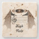 Black and grey sheet music with a whole note.. The sheet music has a pair of brown bat wings hinting that the whole note is in ultra high audio range.