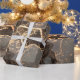High resolution. Luxury abstract fluid art painting in alcohol ink technique, mixture of black, grey and gold paints. Imitation of marble stone cut, glowing golden veins. Tender and dreamy design.