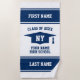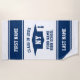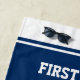 High School Graduation Class of 2025 student gift Beach Towel. Big striped beachtowels to congratulate him or her. Personalised graduation party gift idea for graduating seniors, college grads and university graduate. Large tassel cap logo with sporty varsity stripes and text in custom colour combinations. Fun summer accessories for beach or pool side. Navy blue and white or custom background colour. Add your own custom first and last name, monogram, state, city, year etc.