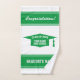 Custom High School Graduation Class of 20XX tassel cap Hand Towel. Personalised gift idea for graduating senior, college grad, nursing school grad and university students. Green and white varsity stripe design colour example.
