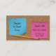 This unique, professional teacher business card is suited for elementary, intermediate, and secondary teachers. It features a blue and pink post it or sticky notes and a torn piece of note paper stuck to cork board with round push pins and a pencil and paperclips on the writing surface. This business card is also perfect for office clerks, receptionists, office workers, students looking for summer work, professionals working at a desk, writers, professors, human resources, and anyone looking for a unique and fun office stationary business card. ©2012 Pam's Designs.