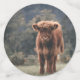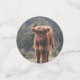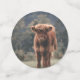 Highland cow calf autumn grass field photograph. Stunning young calf of highland Scottish cattle on an autumn grassy field with muted colours. Beautiful dark hairy orange coat contrasting with light yellow green grass and trees in bokeh in background.