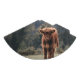 Highland cow calf autumn grass field photograph. Stunning young calf of highland Scottish cattle on an autumn grassy field with muted colours. Beautiful dark hairy orange coat contrasting with light yellow green grass and trees in bokeh in background.