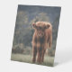 Highland cow calf autumn grass field photograph. Stunning young calf of highland Scottish cattle on an autumn grassy field with muted colours. Beautiful dark hairy orange coat contrasting with light yellow green grass and trees in bokeh in background.