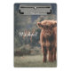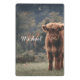 Highland cow calf autumn grass field photograph. Stunning young calf of highland scottish cattle on an autumn grassy field with muted colours. Beautiful dark hairy orange coat contrasting with light yellow green grass and trees in bokeh in background. Custom personalizable monogram with your name and inital on the left.