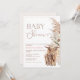 Bohemian inspired baby shower invitation featuring a highland cow and calf, an earthy colored floral arrangement with pampas grass on the right hand side of the invitation and a modern serif and calligraphy image heading in a faux gold foil texture. Ideal for anyone having a cow themed and bohemian inspired baby shower.