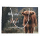 Highland cow calf monogram first birthday party. Stunning young calf of highland scottish cattle on an autumn grassy field with muted colours. Beautiful dark hairy orange coat contrasting with light yellow green grass and trees in bokeh in background. Custom personalizable monogram with your name and initial on the left. Everything for the first birthday of your child, invitations, paper plates, cups and more.
