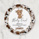 Cute holy cow themed birthday party tag for a little boy featuring a cute highland cow image and a brown cowhide pattern background.