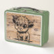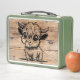 This cow is ready to eat, how about you? Faux woodgrain background with Baby Highland Cow licking it's lips on Green Metal Lunchbox.