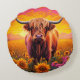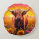 Highland Cow in Sunflowers at Sunrise Round Cushion