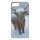 A photograph of a highland cow in the middle of the snow after a snow storm.