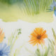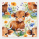 Watercolor farm animals highland cow in a field of flowers.