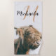 Highland cow portrait custom name initial monogram. Portrait photograph of a majestic orange brown highland cattle on a foggy day with white background.
