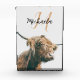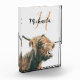 Highland cow portrait custom name initial monogram. Portrait photograph of a majestic orange brown highland cattle on a foggy day with white background.